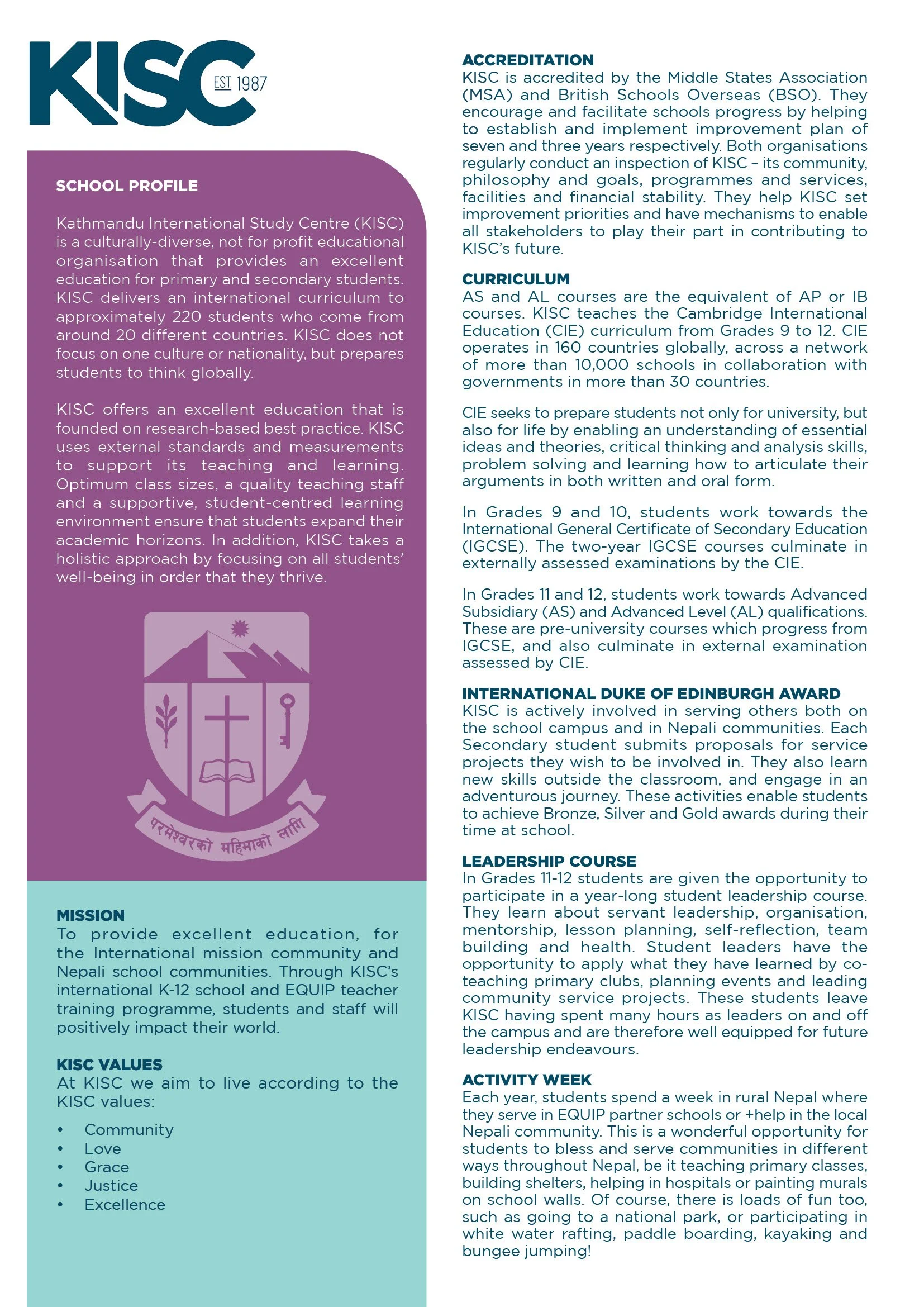 KISC is a culturally-diverse international Christian school that provides an excellent education for primary and secondary students.